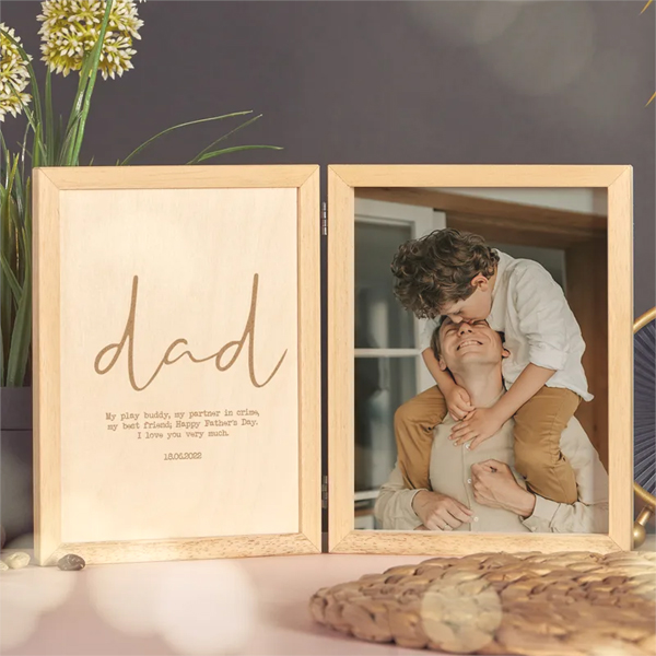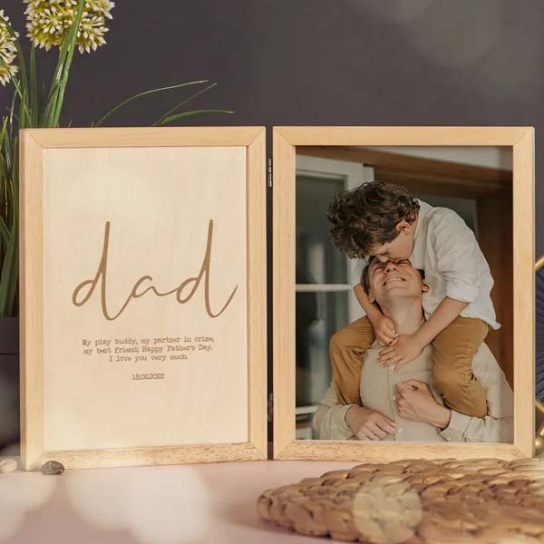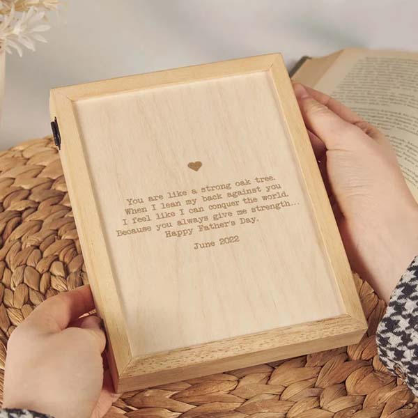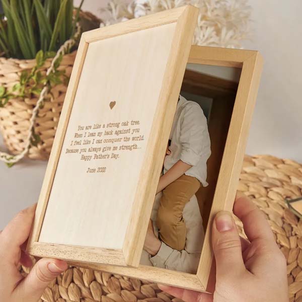 The custom engraved photo gift box is meticulously designed to hold a favorite photograph, while the other side of the hinged frame allows for a special message, name, or date to be engraved, making each piece unique and deeply personal. The elegant wooden finish complements any office or home decor, seamlessly blending with various styles and preferences.